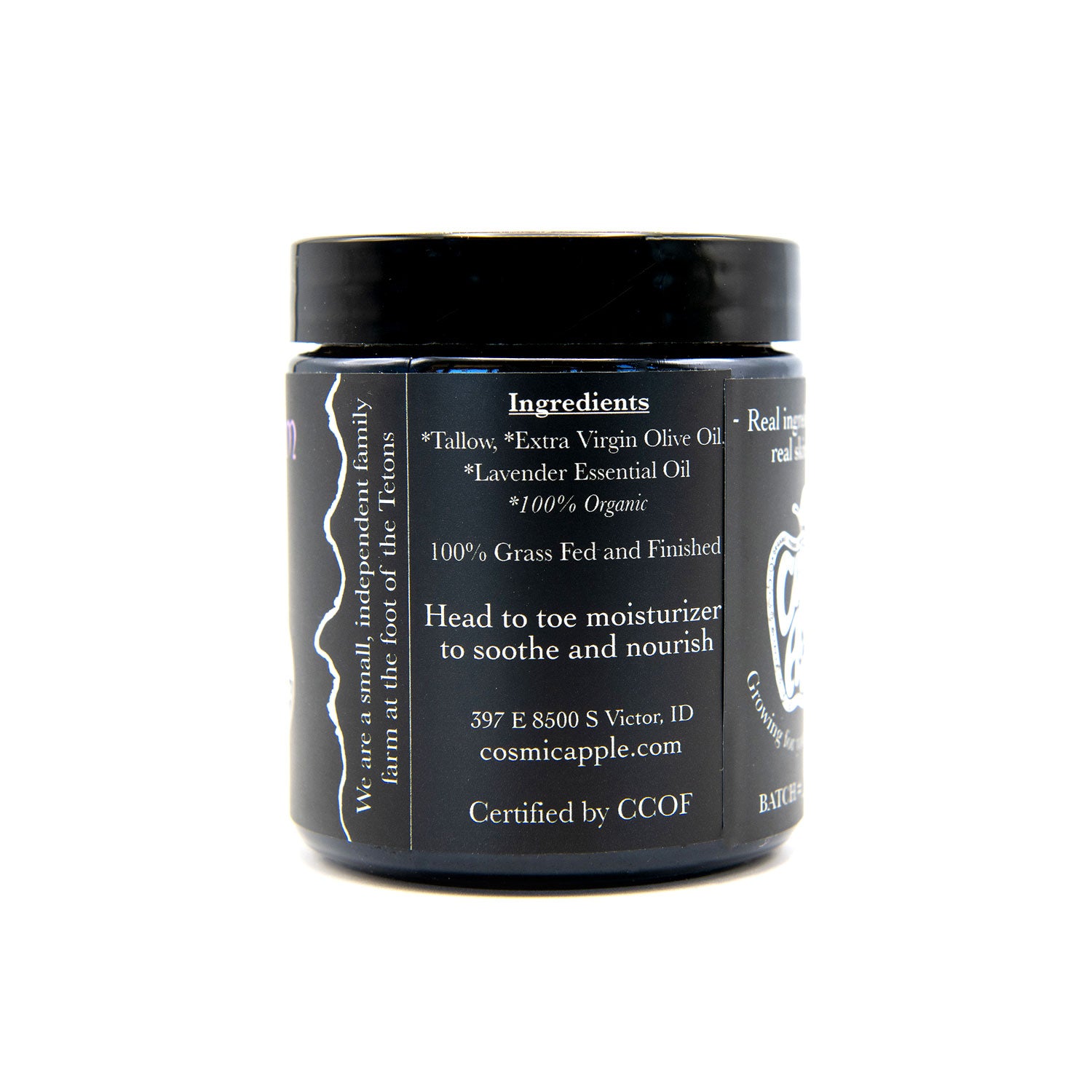 Simple, pure, soothing, ingredients. Organic Tallow, Organic Extra Virgin Olive Oil and Organic Essential Oil of Lavender